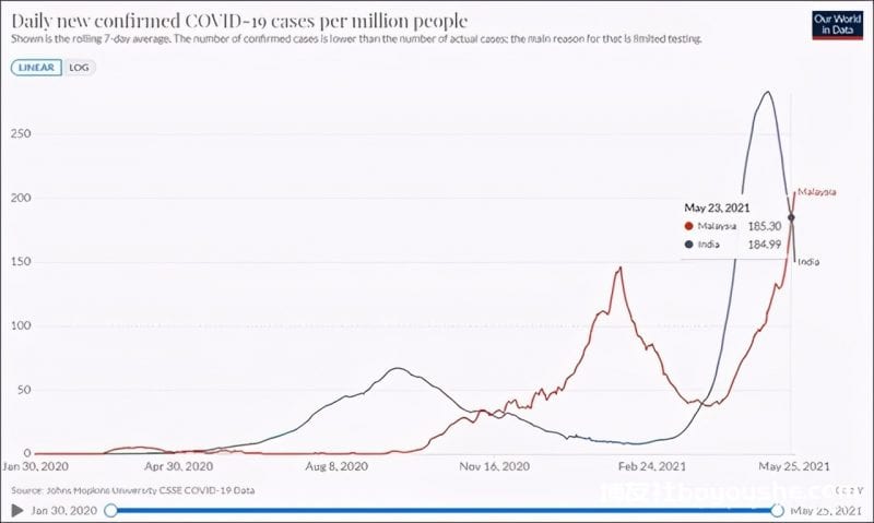 根据“Our World in Data”的数据显示,随着近日马来西亚每日确诊新增病例的快速增加,其单日每百万人感染新冠病毒的比例已经超过印度。