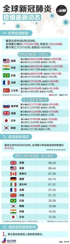 根据Worldometer实时统计数据,截至北京时间6月6日8时,全球累计确诊新冠肺炎病例超过1.74亿例,累计死亡374万例;截至北京时间6月6日8时,全球累计新冠疫苗接种数量约20.91亿剂。