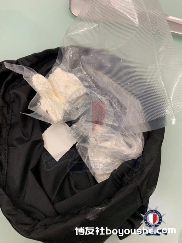 在他家中搜查后发现了 150 克疑似可卡因的白色物质。