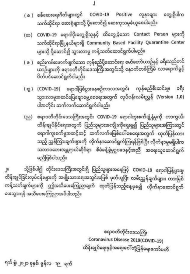 已经重启的检查站包括:伊洛瓦底省边界区的么梅泽利检查站(酿栋)、克缇雅检查站(马乌宾)、殴崩检查站(坚景)、耶南达检查站(耶基)和叠德耶检查站等。计划进入伊洛瓦底省的人,均需接受体温检测,如发现体温异常,血氧低,将由检测者自费检测。如发现确诊,将送往医院进行隔离治疗。从居家隔离镇区前往伊洛瓦底省的人,均需接受为期10天的隔离,期间将接受2次检测。