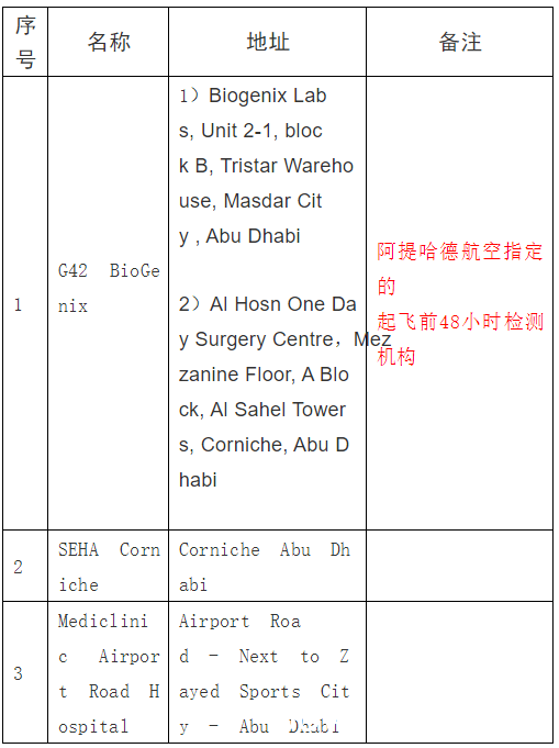 (五)阿提哈德航空公司指定的起飞前48小时检测机构较为特殊,请务必提前查询了解航司《旅行指南和规定》(https://www.etihad.com/zh/travel-updates/all-destinations-travel-guides),确保检测报告满足各方要求。