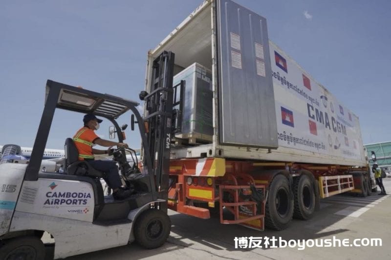 6月28日早,柬埔寨政府采购的100万剂科兴疫苗已运抵金边国际机场。