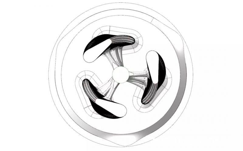 大楼的底座是一个几乎悬浮的结构,还安装有一个巨大的电机,大楼的三个螺旋形的主体与中心轴和底座固定连接,就好像螺旋桨一样,在底座的带动下,大楼就能旋转起来了。