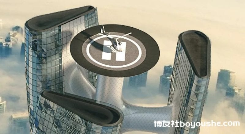 除此之外,在大楼顶上的中心点还有一个圆形停机坪,游客也可从上面进入大楼。