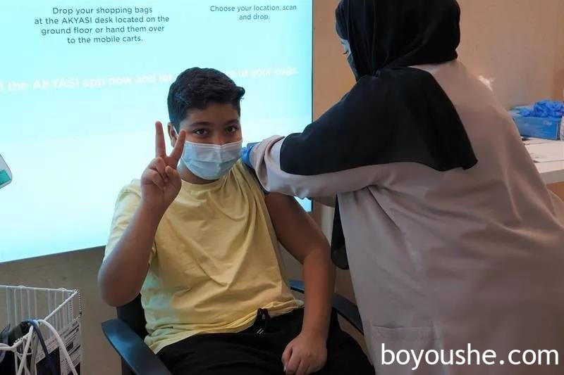 周二,阿布扎比的数百名中校学生和大学生在亚斯购物中心最新投入使用的面向12+儿童的疫苗中心接种了疫苗。