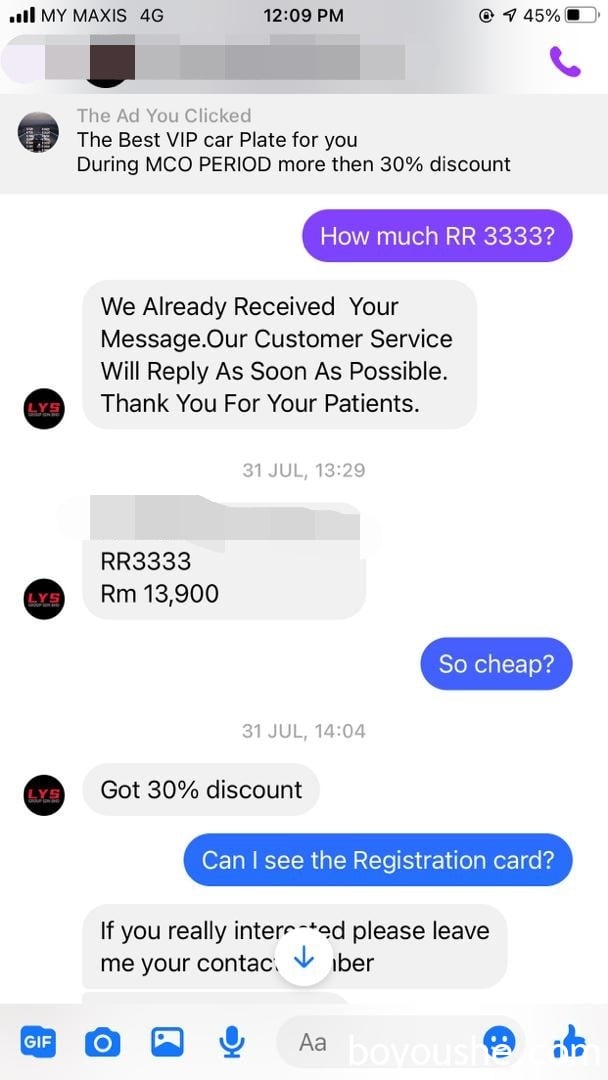 “于是,我便假冒买家,私讯对方以了解真实情况,在被询问价格时,对方开价1万3900令吉,对方更称这是折扣30%后的优惠价格,因此价格非常便宜。”