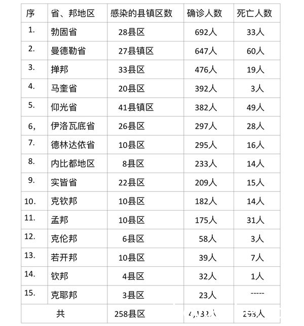 据缅甸卫生部8月6日下午4时所发布的公告,全国各省邦8月5日的确诊人数4132人,死亡人数293人,具体数据如下表:
