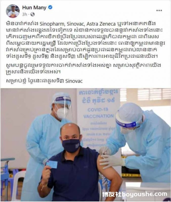 洪玛尼先生在脸书上发布自己接种疫苗的照片并写道:“不管是国药、科兴、阿斯利康又或者其他疫苗,重要的是这些疫苗是通过柬埔寨政府的努力而来,特别是洪森总理一直以来的努力,保证柬埔寨有足够的疫苗为数百万人民进行接种,包括第一针、第二针甚至第三针,皆是为了保护我们人民的生命。”