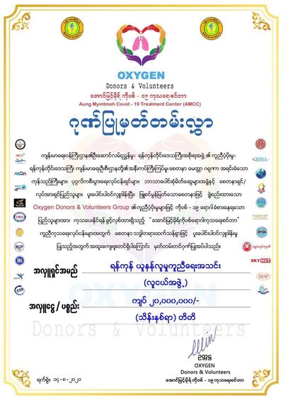 “氧气捐助者和志愿者组织”(Oxygen donors and volunteers group)受到缅甸各业界和社会广泛支持,发起建立了昂敏莫新冠肺炎治疗中心Aung Myintmoh COVID-19 Treatment Center (AMCC)。