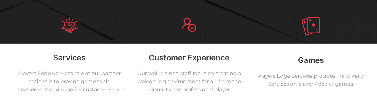 Players Edge Services是由Patrick Tierney, Jamie Shigg和David Shindle共同创建的,他们为加州的客户和合作伙伴带来了超过60年的游戏经验;承诺提供优质服务,并建立牢固的关系。