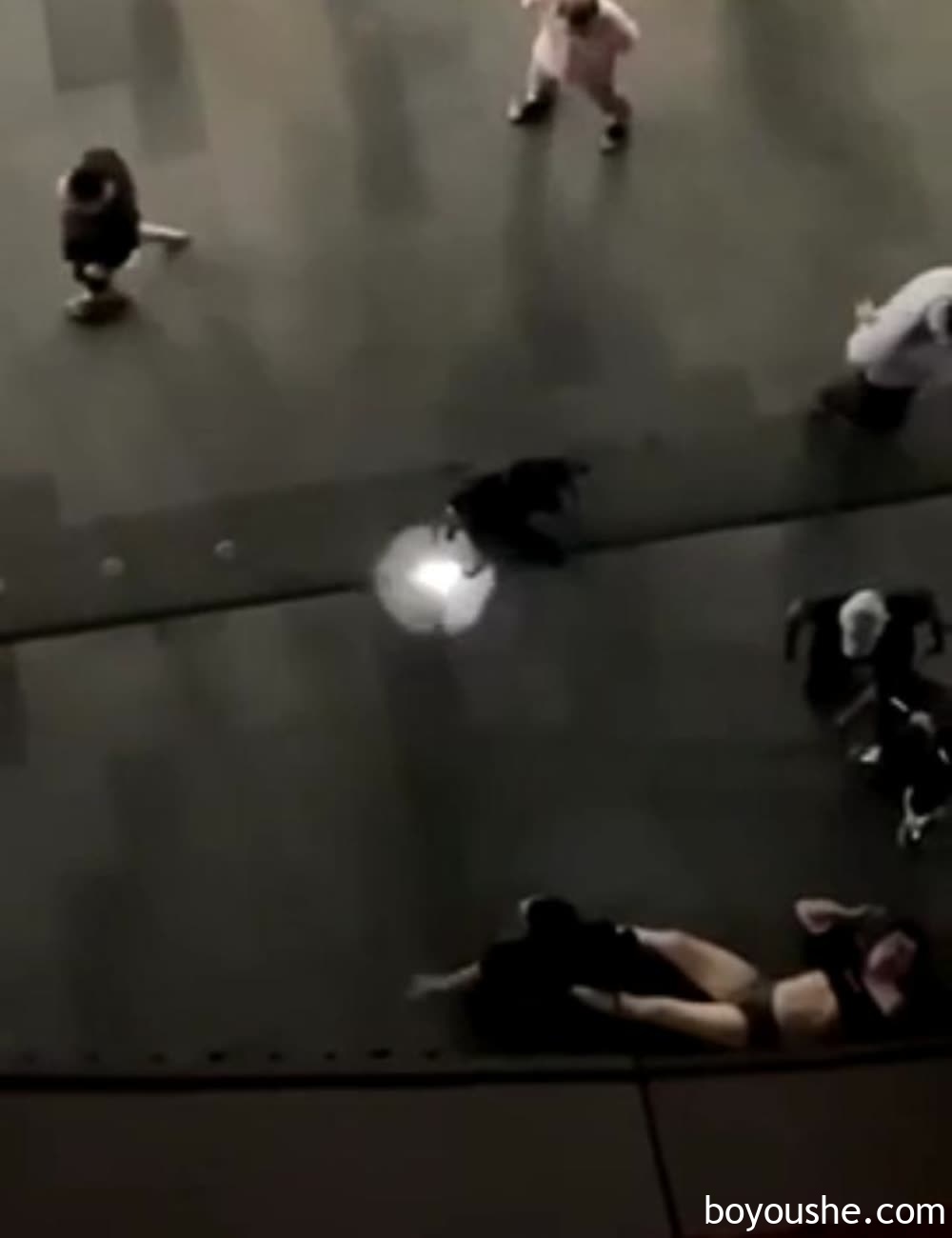 第二个视频显示,一个身穿白色上衣、身形较瘦的中国男子被几个人黑衣人从一栋大楼前扛着走出来,一些人在旁边围观无动于衷,白色上衣男子因被几人控制住,怎么也无法挣脱,旁边还有的人手拿电棒。