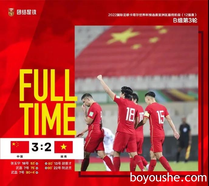 在比赛过程中,第53分钟,张玉宁补射破门;第75分钟,武磊头球破门;第80分钟,胡晋才扳回一球;第90分钟,阮进灵扳平比分;第95分钟,武磊在加时阶段完成绝杀;最终,国足3-2击败越南,收获了12强赛的首胜。