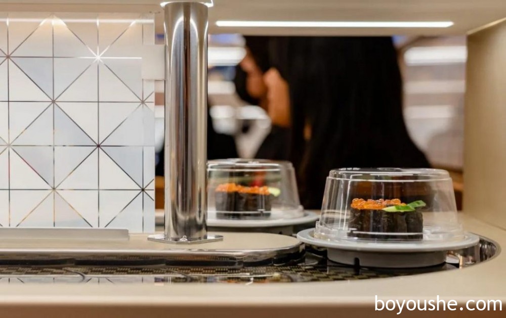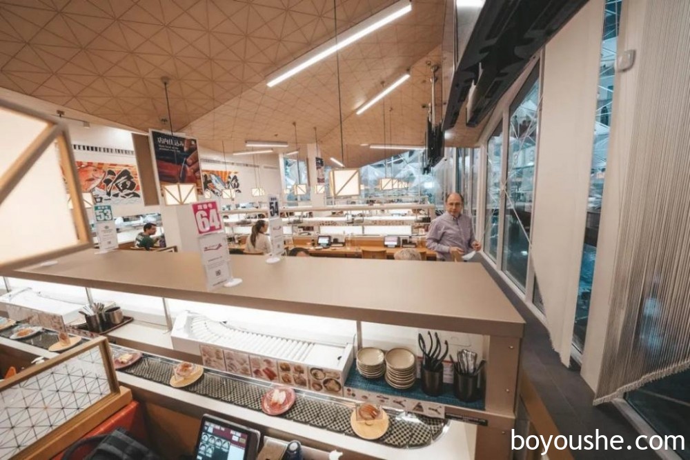 旋转寿司履带分割出餐区,可能因为疫情的缘故,每张桌子之间还加设了不透明的隔板,不同桌的客人之间彼此是看不到的。