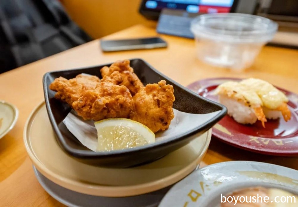 日料的开胃菜一定有唐扬炸鸡,这是转盘之外单点的,没想到出菜特别快,没几分钟就从后厨通过传送带直达我们的桌子,相当的热乎。不过炸鸡相对老了一些,但是味道很正,还是值得推荐。