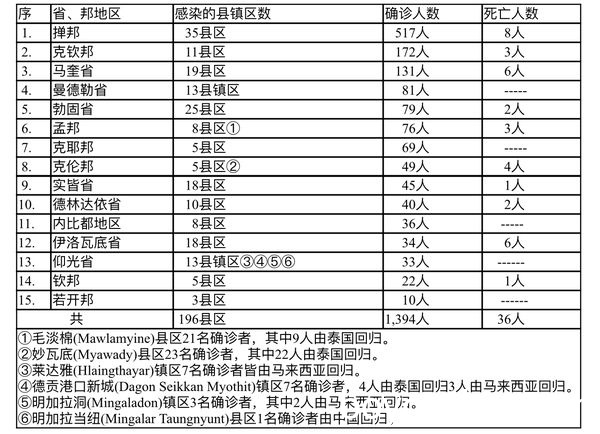 缅甸卫生部于10月8日下午5时发布的公告,全国各省邦10月7日的确诊人数共为1394人,死亡人数36人,具体数据如下表: