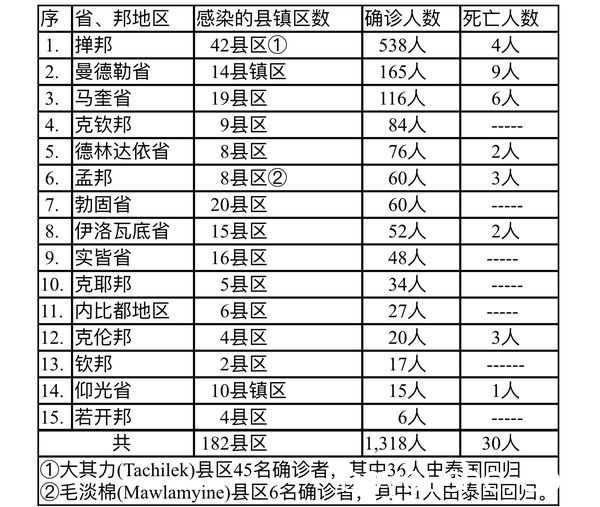 缅甸卫生部于10月11日下午4时发布的公告,全国各省邦10月10日的确诊人数共为1318人,死亡人数30人,具体数据如下表: