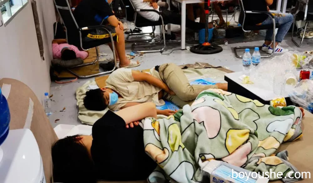 上图为上个月,柬埔寨警方突袭一非法窝点,进入窝点时一些人在地板上睡觉,旁边人在上班。