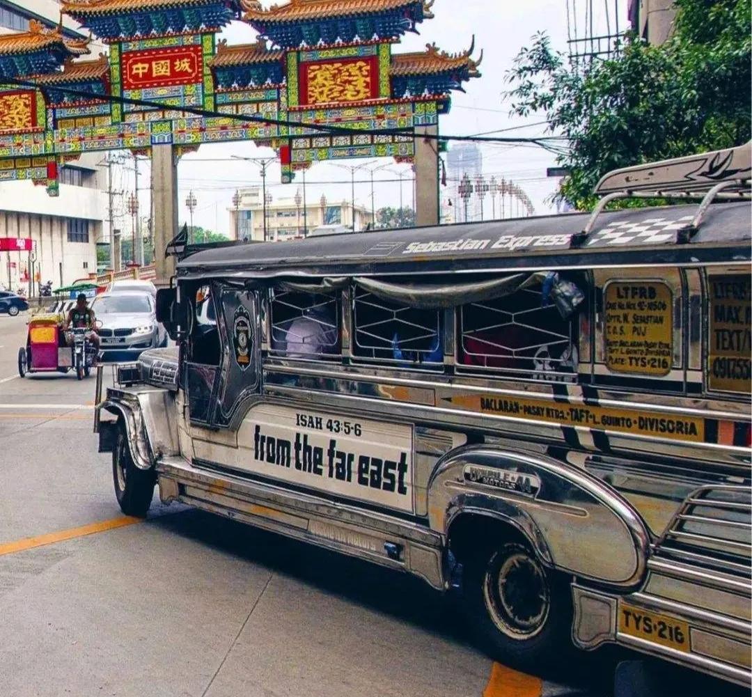 吉普尼是菲律宾一种特别有意思的交通工具,从正面看上去像吉普车一样,但是要比大多数吉普车的车身都长,吉普尼在菲律宾就类似于公交车一样,在马路上招手就停,乘客上车时交钱给司机的时候是最有意思的,因为乘客离司机较远,只能通过其他乘客帮忙递的方式把钱交到司机手上。