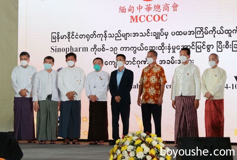 中国驻缅甸大使馆于边疆参赞在致词中说到:缅甸中华总商会自愿自费接种疫苗面向全缅,不分民族、不分宗教、不分国籍,为当地华人华侨、当地民众、以及泰国、新加坡、日本、韩国等20多个国家的侨民接种疫苗,共有34.3万人接种疫苗,缅甸中华总商会的自愿自费接种疫苗工作,也成为中国大使馆春苗行动的有力拓展和延伸,为缅甸筑起了一道抗疫屏障,为缅甸的抗疫事业添砖加瓦。