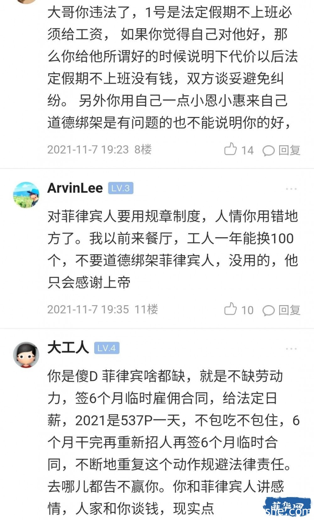 底下留言讨论的方向有二,一是11月1日应不应该给双倍工资;二是吐嘈菲律宾人。而高赞的那条留言是,应该給双倍工资…….