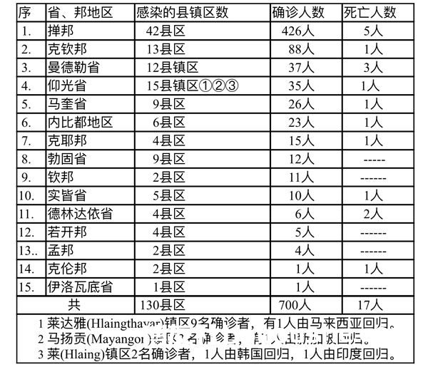 缅甸卫生部于11月16日下午4时发布公告,全国各省邦11月15日的确诊人数共为700人,死亡人数17人,具体数据如下表: