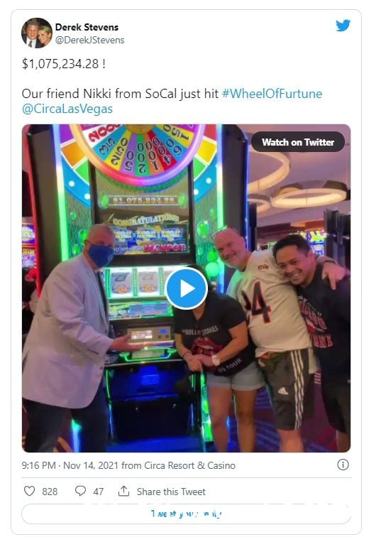 两天后,一名来自南加州的女子在Circa的幸运轮老虎机上中了头奖,据店主德里克·史蒂文斯说。头奖金额为1075234.28美元。史蒂文斯在推特上分享了一段视频,视频中他和获胜者尼基在幸运机器前合影。