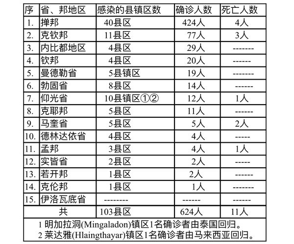 缅甸卫生部于11月20日下午4时发布公告,全国各省邦11月19日的确诊人数共为624人,死亡人数11人,具体数据如下表: