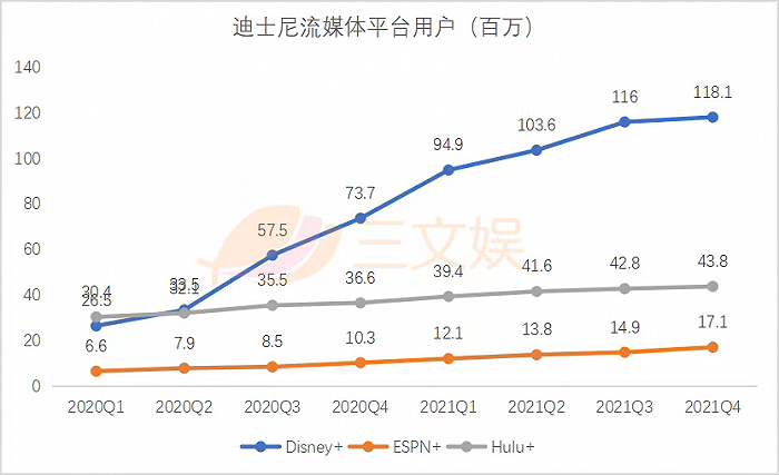 体育垂类流媒体平台ESPN+的订阅用户数在2021财年也取得不错的增长——66%,甚至略高于Disney+的增长幅度。