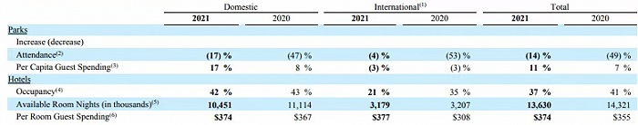 2021财年,迪士尼乐园的游客客流和酒店入住率相比上一年度都不算特别理想。