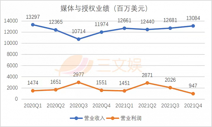 2020财年,迪士尼的乐园和衍生品业务遭到疫情暴击,2021财年第三季度以来,开始缓慢复苏。该业务全年营收165.52亿美元,同比下滑2.8%;营业利润4.71亿美元,同比增长3.5%。