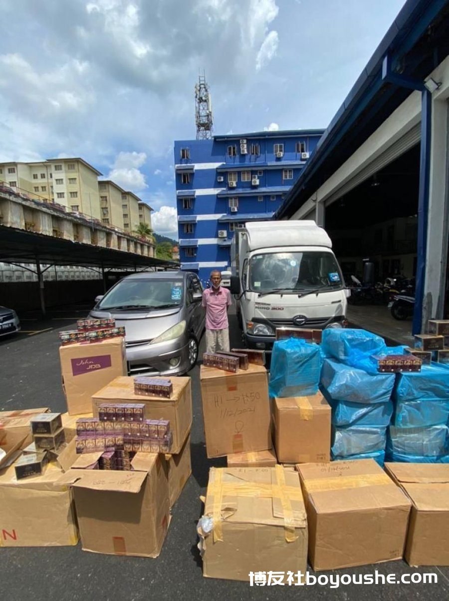 66岁外籍男子通过休旅车及罗里载运逃税额逾23万令吉的走私烟,惟最终被警方慧眼识破,连人带货被押返警局助查。