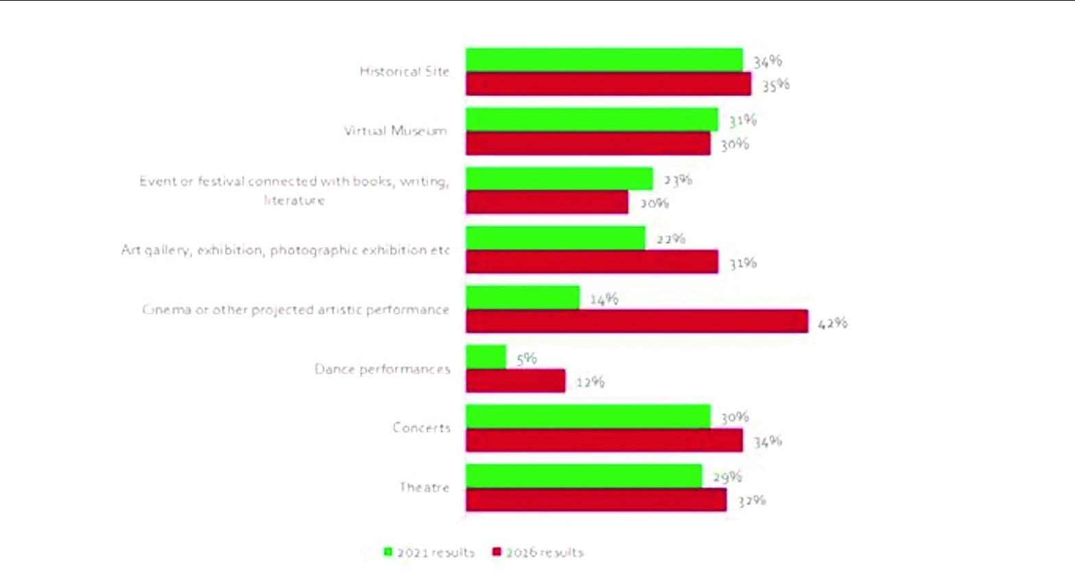 只有 5% 的受访者表示,自去年放宽限制以来,他们曾亲自参观过历史遗迹,其中 5% 的人参加了画廊展览,4% 的人去看了音乐会,4% 的人去了文学活动,4% 的人去了电影院, 4% 去了博物馆,3% 去了剧院,2% 去了现代舞表演,1% 去了一般舞蹈表演。