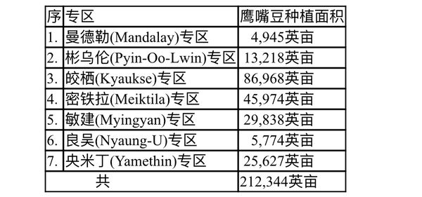 该冬作物鹰嘴豆在目前6个月财政过渡期中将在省内的7个专区内种植,各专区规划种植的面积分别为:曼德勒专区4,945英亩,彬乌伦(Pyin-Oo-Lwin)专区13,218英亩,皎栖(Kuaukse)专区86,968英亩,密铁拉(Meiktila)专区45,974英亩,敏建(Myingyan)专区29,838英亩,良吴(Nyaung-U)专区5,774英亩,央米丁(Yamethin)专区25,627英亩,共21多万英亩。直到目前种植的面积已达到74,000多英亩了。