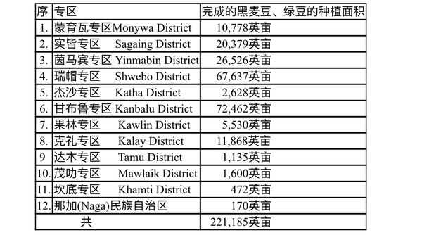 目前,实皆省内的11个专区及那加民族自治区内的各个县区,作为冬作物种植完毕的黑麦豆有137,921英亩,绿豆则有83,264英亩。