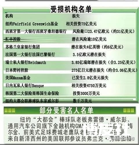 据华尔街日报的统计资料,损失金额超过1亿美元的受害者就可列出数十名之多,其中著名机构包括:Fairfield Greenwich 集团 75亿美元;万通金融集团旗下的对冲基金Tremont公司 33亿美元;西班牙桑坦德银行亏损30亿美元;桑坦德银行(Santander)28.7亿美元;奥地利银行(Bank Medici AG )21亿美元;Ascot Partners 18亿美元;纽约投资公司“Access International Advisors”14亿美元;富通(Fortis Group) 13.5亿美元;瑞士银行10亿美元,汇丰银行损失多达10亿美元,苏格兰皇家银行损失4亿英镑,野村控股损失可能达3亿美元,而投资于麦道夫或向麦道夫提供借贷的大型金融机构潜在损失达100亿美元。就连国际奥委会都被骗了4.8亿美元。