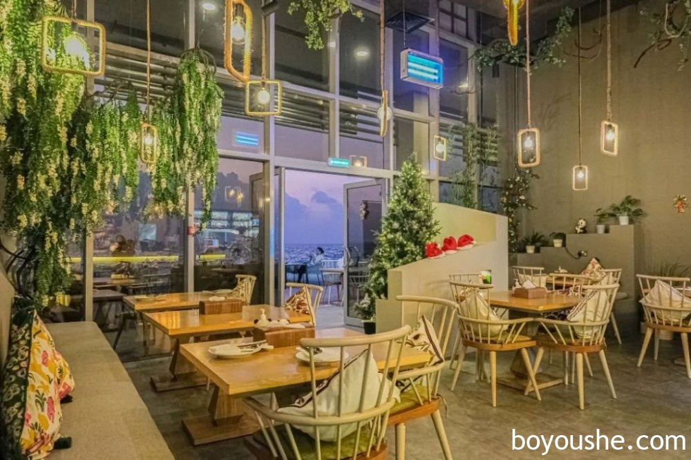 熊猫烧烤的设计有着一股小清新风,和大海与海风很般配。整个店里使用的是非常柔和的白色与原木作为主色调,打造了一个慵懒的休息社交空间,让人疲惫的神经一下子就放松下来。