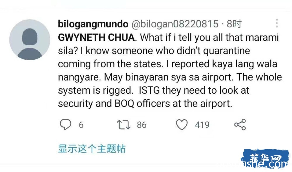 这网友们马上就p了图,即将稳定的疫情又慢慢被该女子拉扯回来了。虽然近期疫情的反弹不全因为该女子,但菲律宾这两年最控制不好的就是境外输入。几次爆发都因为境外输入,可政府依旧并不会对这些犯错的单位和人进行惩罚。难道这2022年又将回到死循环吗?只想对这些境外人员说,回来就好好隔离不行吗?做人多点责任心吧!