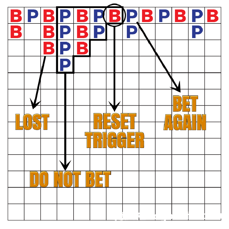从平坦的牌路开始分析,遵循着趋势的规则下注。当你在一种牌路趋势中连输3次时,你该做的事情立刻切换到另一种趋势的下注方法,然后观察它是不是照着预期的走向。