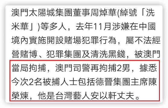 1月30日上午10点,澳门司警局召开记者会,证实安以轩老公陈荣炼因涉及经营赌博集团被逮捕,现已被移送至检察院。