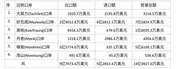 在缅泰边贸交易中,由大其力(Tachileik)边贸口岸出口为1020.7万美元,进口为2195.8万美元,进出口总额为3216.5万美元。而妙瓦底(Myawady)边贸口岸缅方出口为2亿9012.8万美元,进口为4亿6812.1万美元,进出口总额7亿5824.9万美元。高栋(Kawthaung)边贸口岸出口为9556.3万美元,进口为479万美元,进出口总额为1亿0035.3万美元。丹老(Myeik)边贸口岸缅方出口为1218.2万美元,进口2986.4万美元,进出口总额4204.6万美元。梯客(Hteekhee)边贸口岸缅方出口5亿5774万美元,进口335.1万美元,进出口总额为5亿6109.1万美元。茂山(Mawtaung)口岸缅方出口491.6万美元,进口为45万美元,进出口总额为536.6万美元。