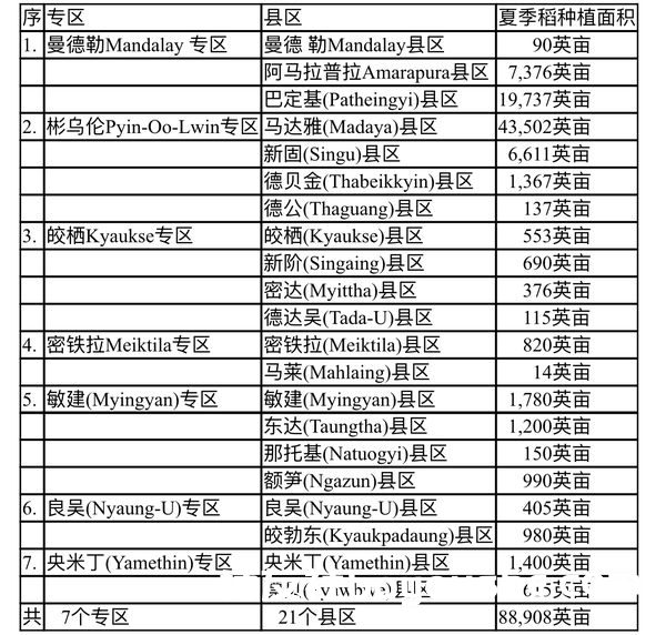 7个专区21个县区内栽种的夏季稻分别为如下: