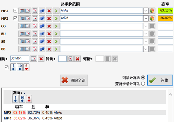 把2换成9,我们就多了后门卡顺的补牌,胜率提高了大约2%。所以计算手牌的赢率是非常复杂的一件事,我虽然写出了方法,但并不建议大家手动去计算,利用工具还是很方便的。