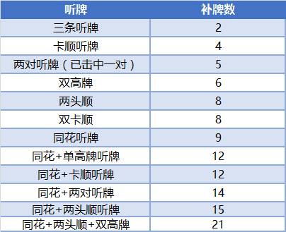 我相信常见的一些听牌的补牌数计算并不困难,大部分人都不太会出错,我会在后面放一张表格,列出所有听牌所需要的补牌数,在这之前,如果你是个新手,希望你自己至少计算一遍。