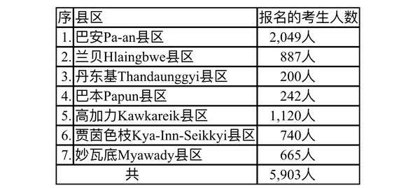 据3月8日出版的《缅甸之光》报报导,2022年3月30日至4月10日举办的大学入学考试,克伦邦地区将有5903位同学参加这考试。报名的学生分别为巴安(Pa-an)县区学生2,049人,兰贝(Hlaingbwe)县区学生887人,丹东基(Thandaunggyi)县区学生200人,巴本(Papun)县区学生242人,高加力(Kawkareik)县区学生1,120人,贾茵色枝(Kya-Inn-Seikkyi)县区学生740人,妙瓦底(Myawady)县区学生665人。