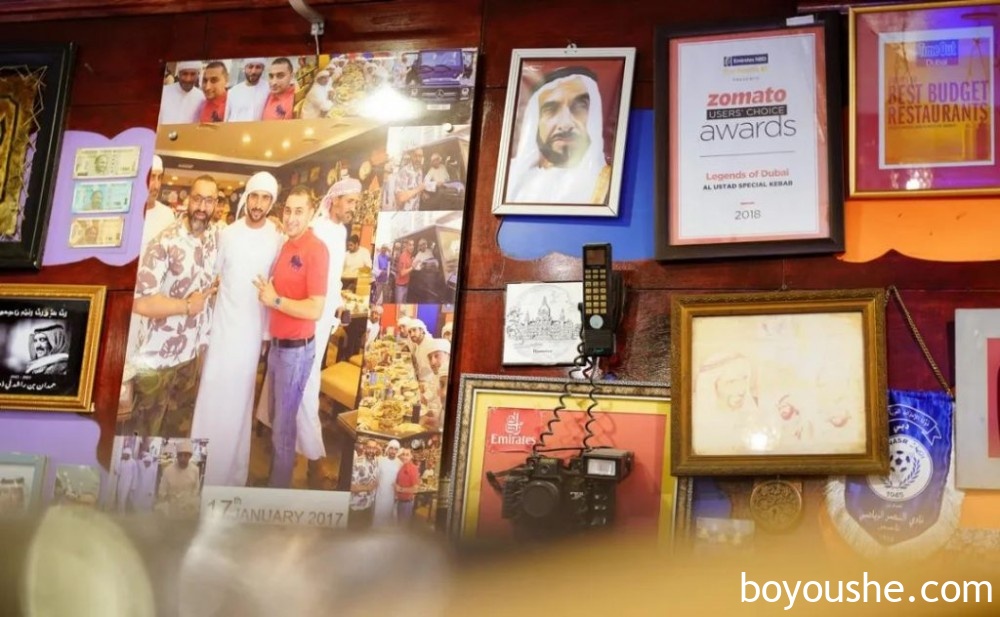 按如今迪拜的土豪标准看,Al Ustad Special Kabab只能说是一家小破店,不仅地方难找,街道也拥挤凌乱。但店内却有着浓郁的怀旧氛围,整个餐厅的墙上装饰着超过8000张老照片、旧手机、老式货币和纪念品等老物件,餐厅主简直把毕生的回忆都挂到了餐厅的墙上。