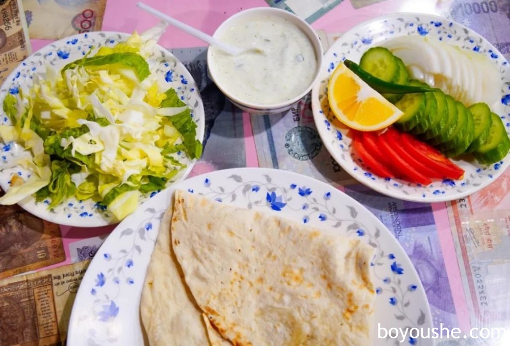 和很多中东餐厅一样,用餐前会免费赠送一盘蔬菜和一小碗加薄荷和黄瓜的酸奶。