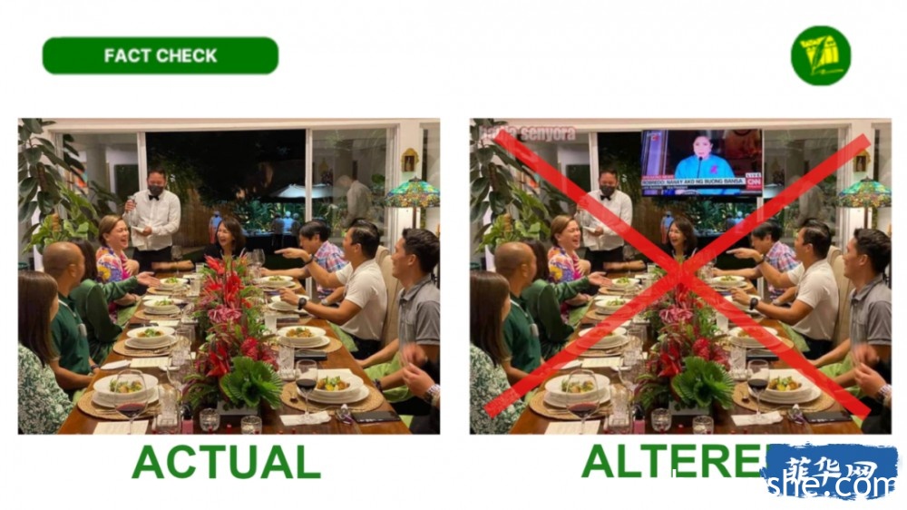社交网络上流传的虚假图片与真实图片的对比。真实图片上的事情发生在去年10月23日,萨拉杜特尔特来宿务期间和小马科斯一同出席加西亚家族的晚宴。后面的那个罗布雷多的电视画面是PS的。