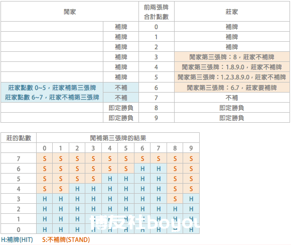 - 补牌规则:说到补牌规则,很多人可能到这边就先放弃了,这边归纳出下面重点,并附上表1让大家能更清楚明了: