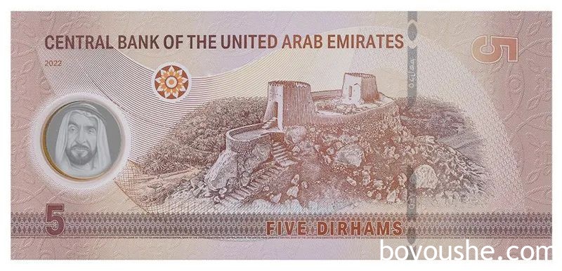 5迪拉姆纸币的正面印着阿治曼堡,这座古老纪念碑见证了阿联酋的历史遗产;反面印着拉斯海玛 Dhayah 堡垒的图像——这是阿联酋另一个著名的文化地标。