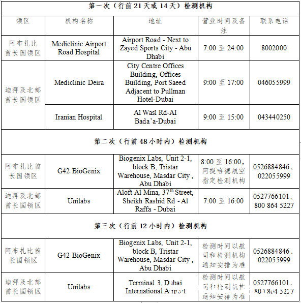 自5月11日起,我馆领区指定检测机构Unilabs(原United Medical Center)第二次(行前48小时内)检测启用新场地。更新后我馆指定检测机构名单信息如下: